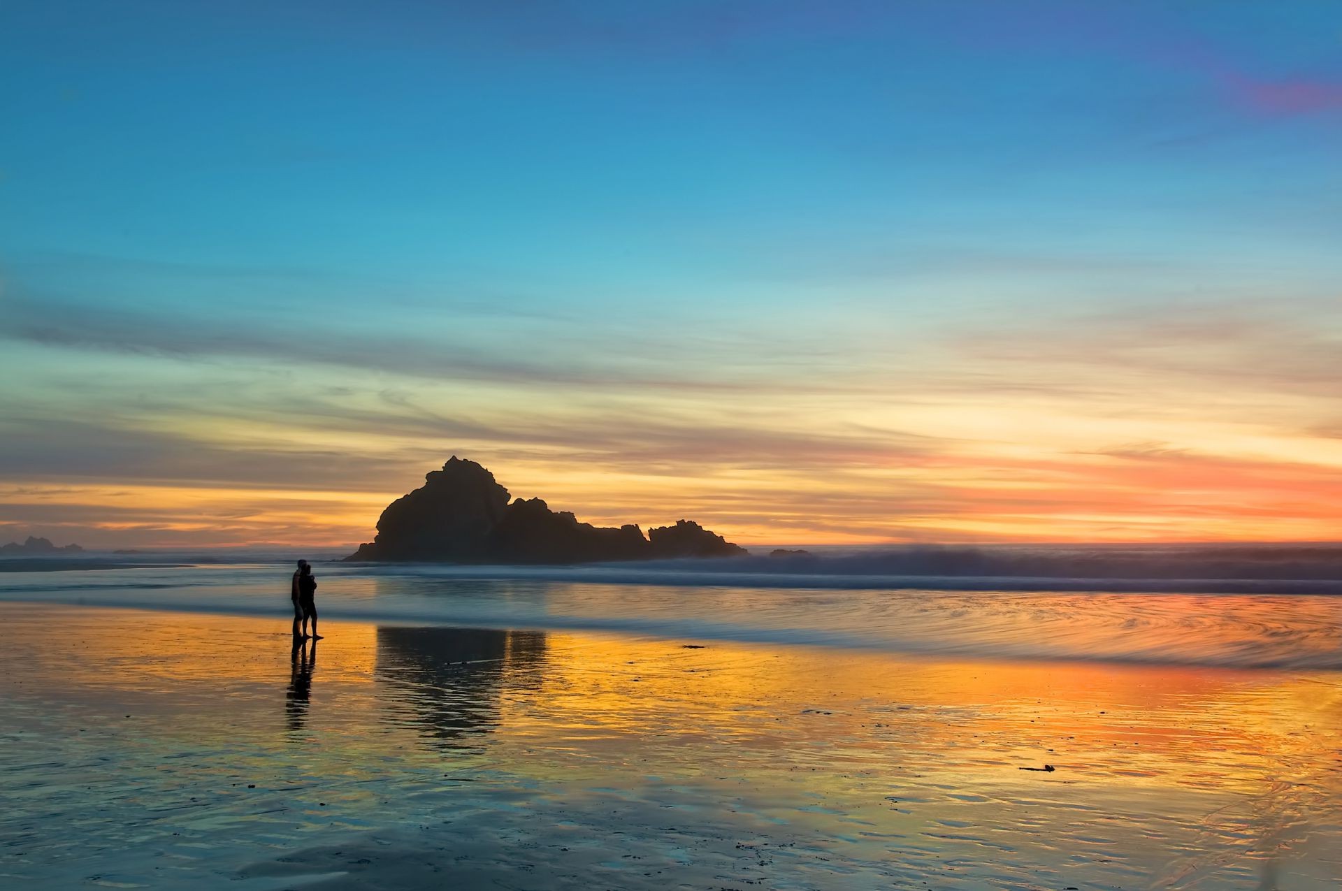 A mountain meadow with purple and crimson flowers and a snag in the background mountains and a sunset sky in the left corner of the sun