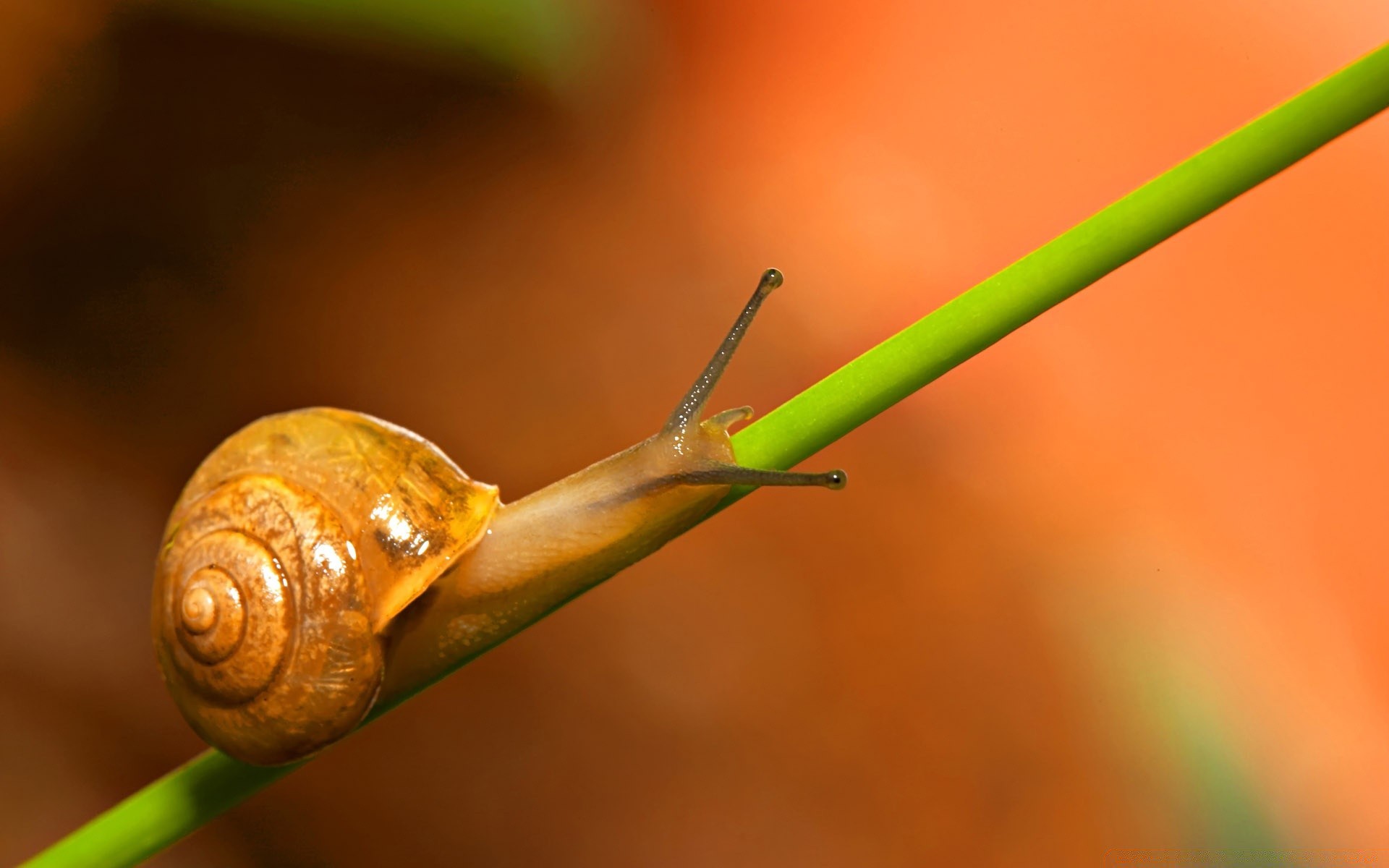 The snail carefully moves along the thin stem