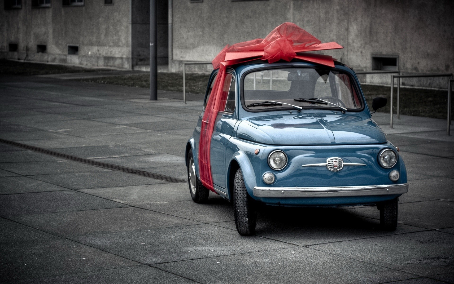 A small blue car with a gift bow