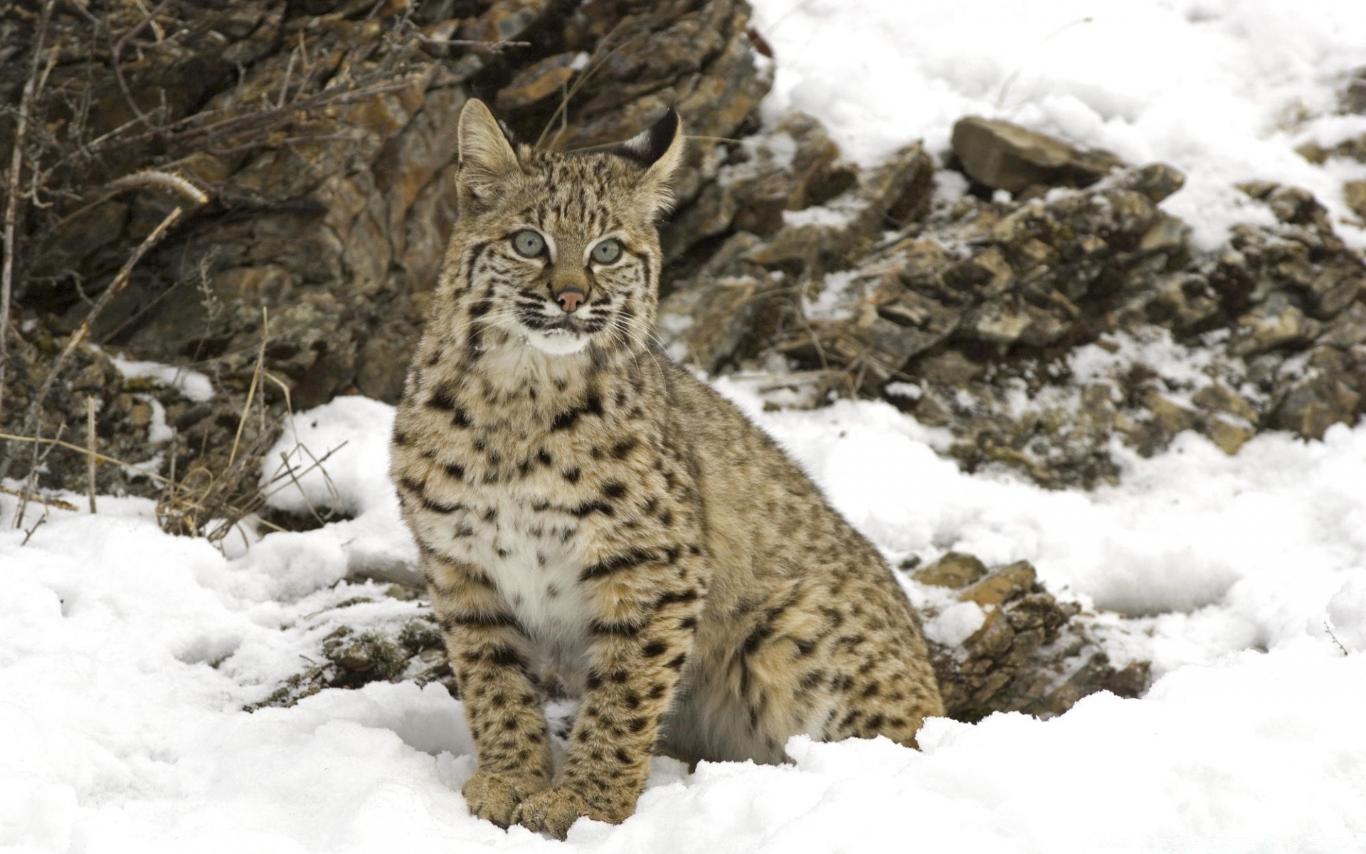A snow leopard is sitting in the snow