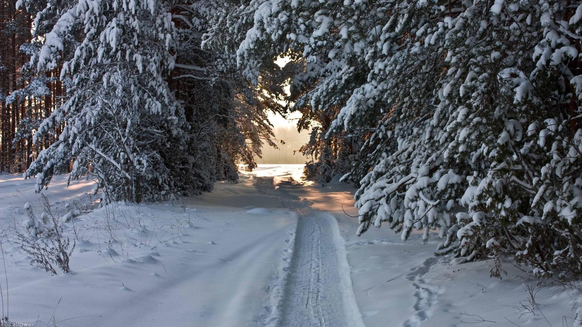 Snowmobile trail in the winter forest
