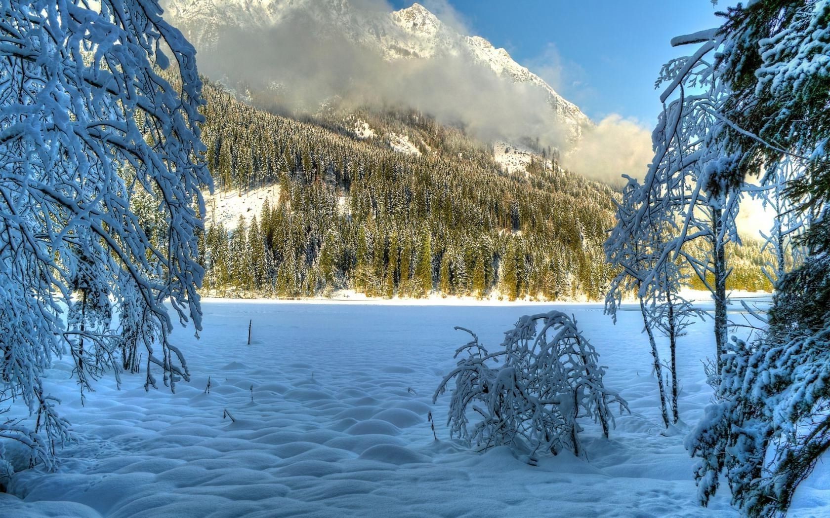 A fabulous New Year's picture. A Christmas tree in the snow in the middle of a fairy tale