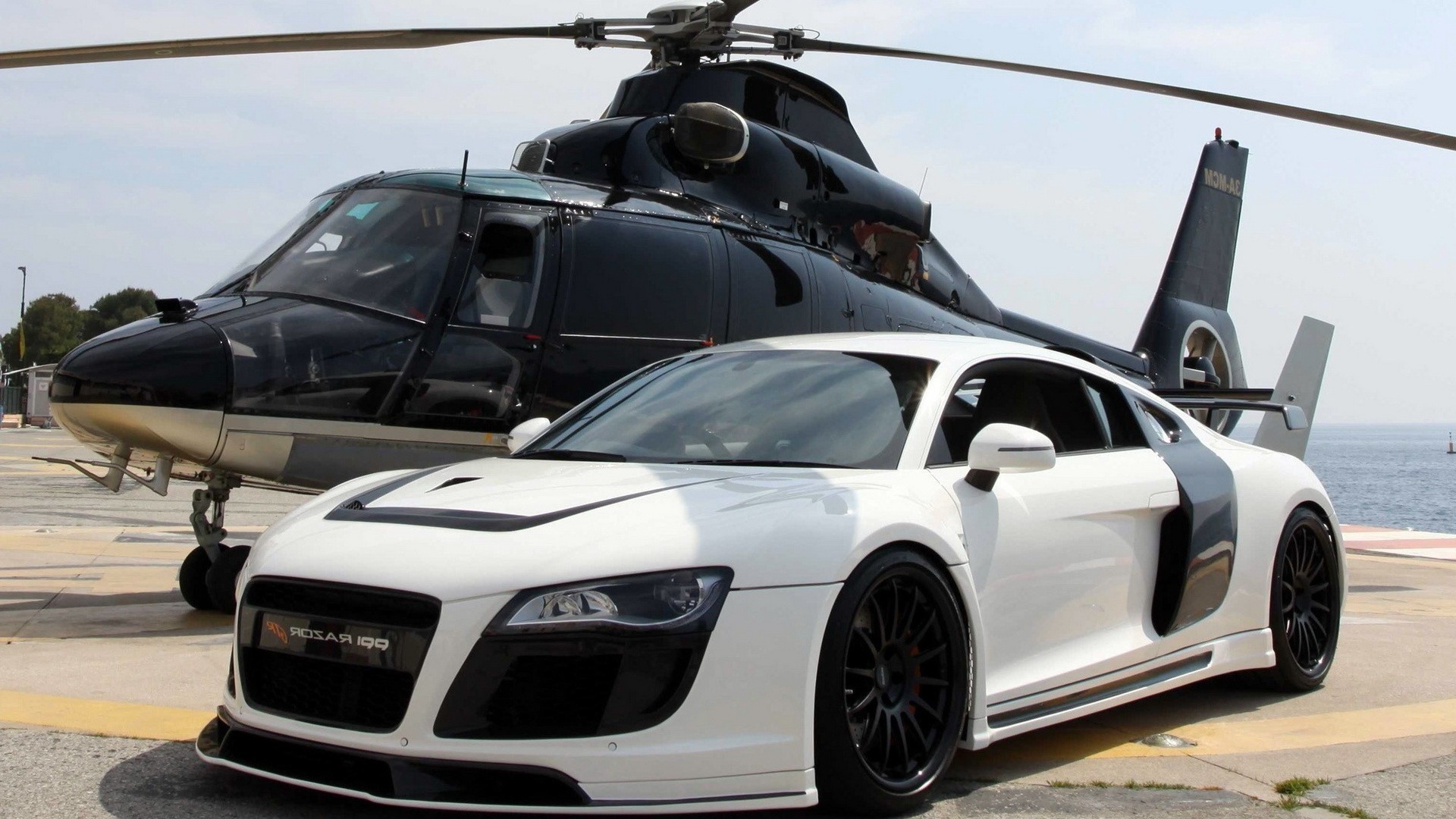 A sports car and a black helicopter nearby