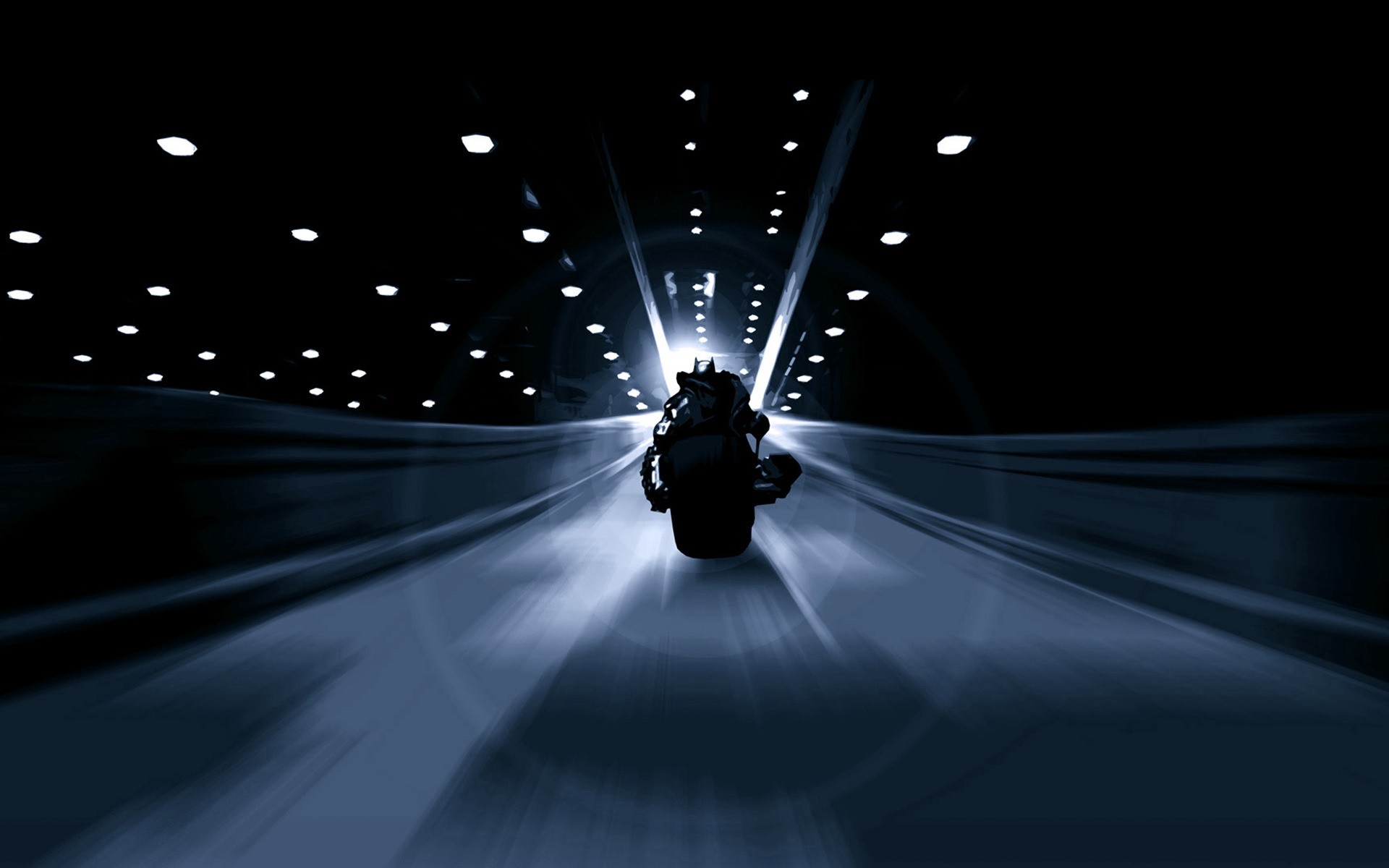 Flying along the black tunnel, along the rare lanterns, a motorcyclist