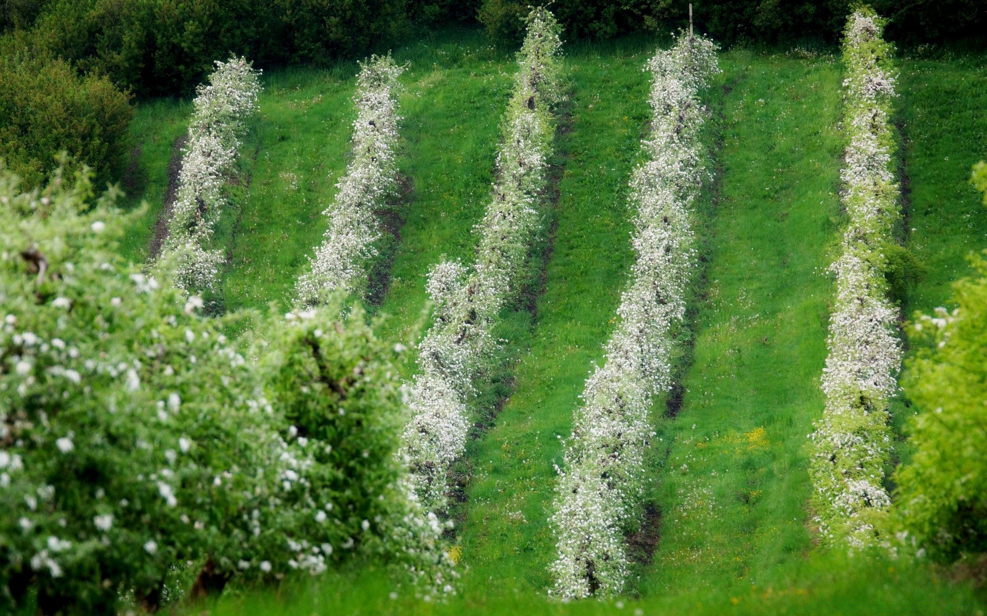 Flowering trees in rows