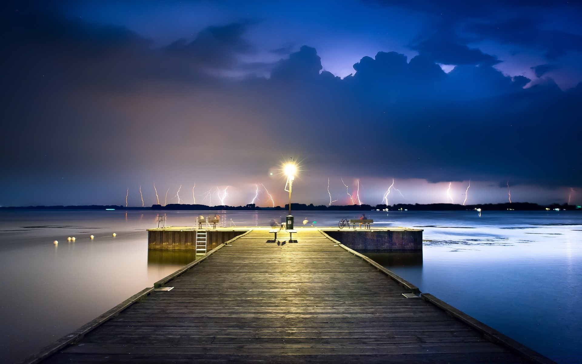 Sky Lightning Sea Water Ocean Pier Lights