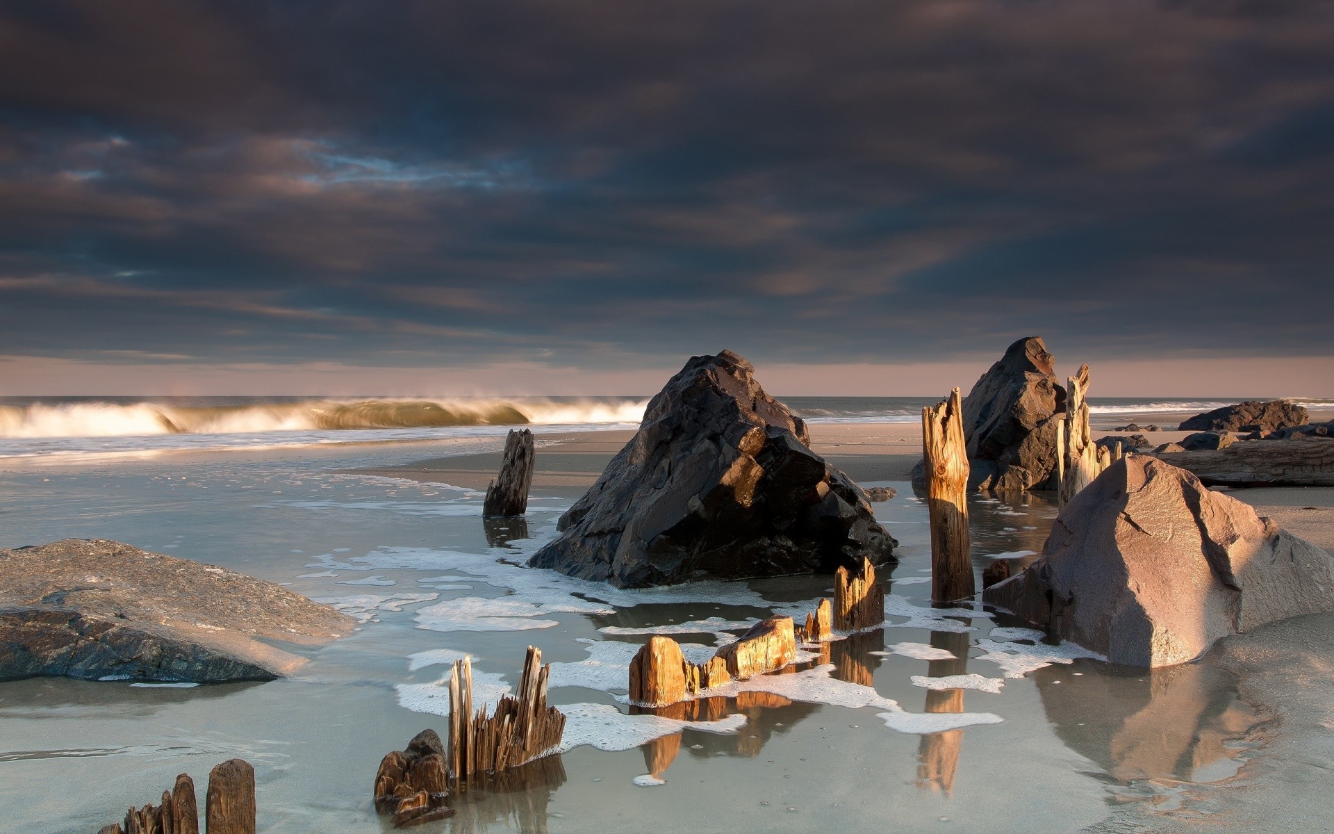 The stones are pieces of wood sticking out of the sea water and covered with white foam