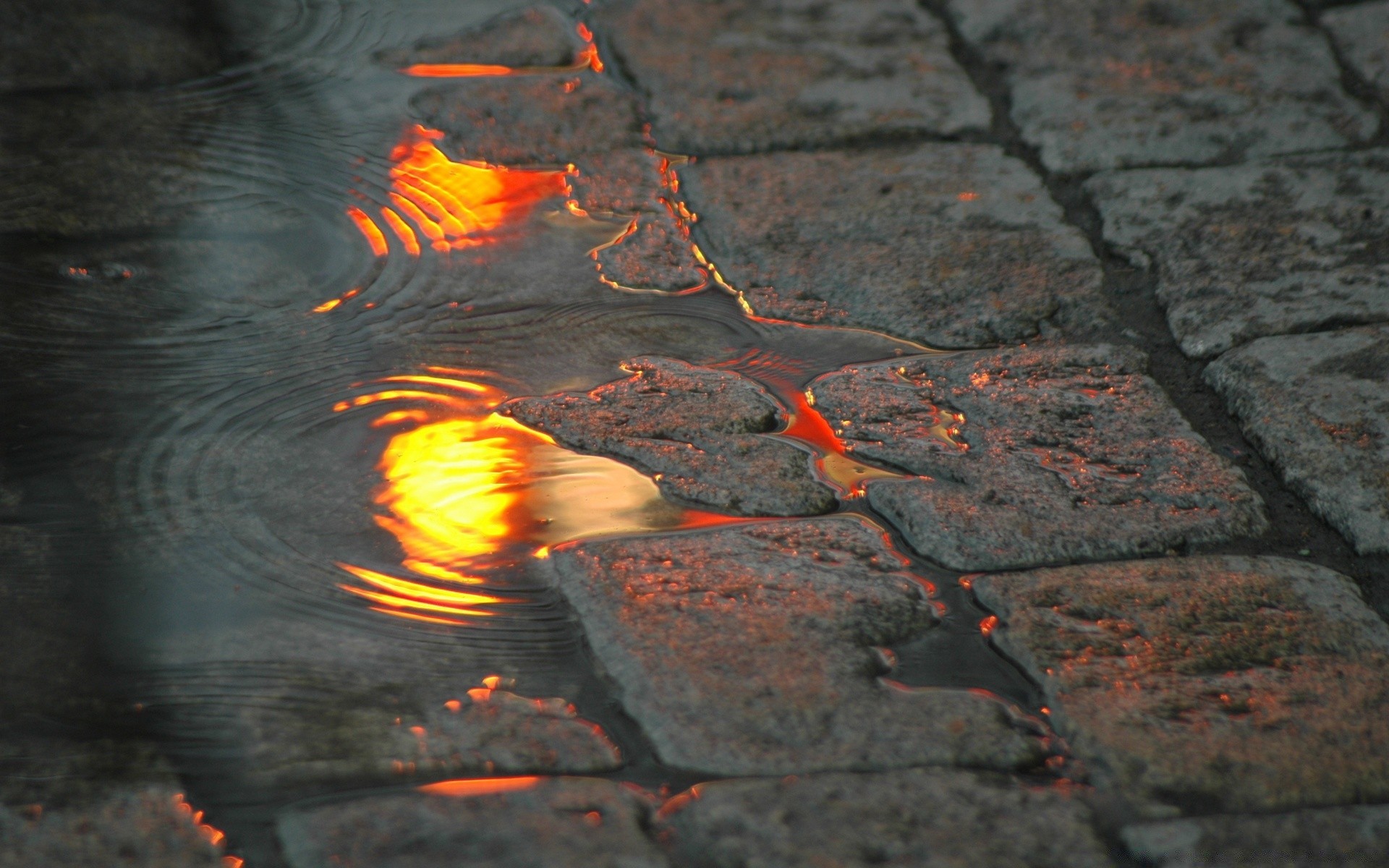 Reflection of the setting sun in a puddle