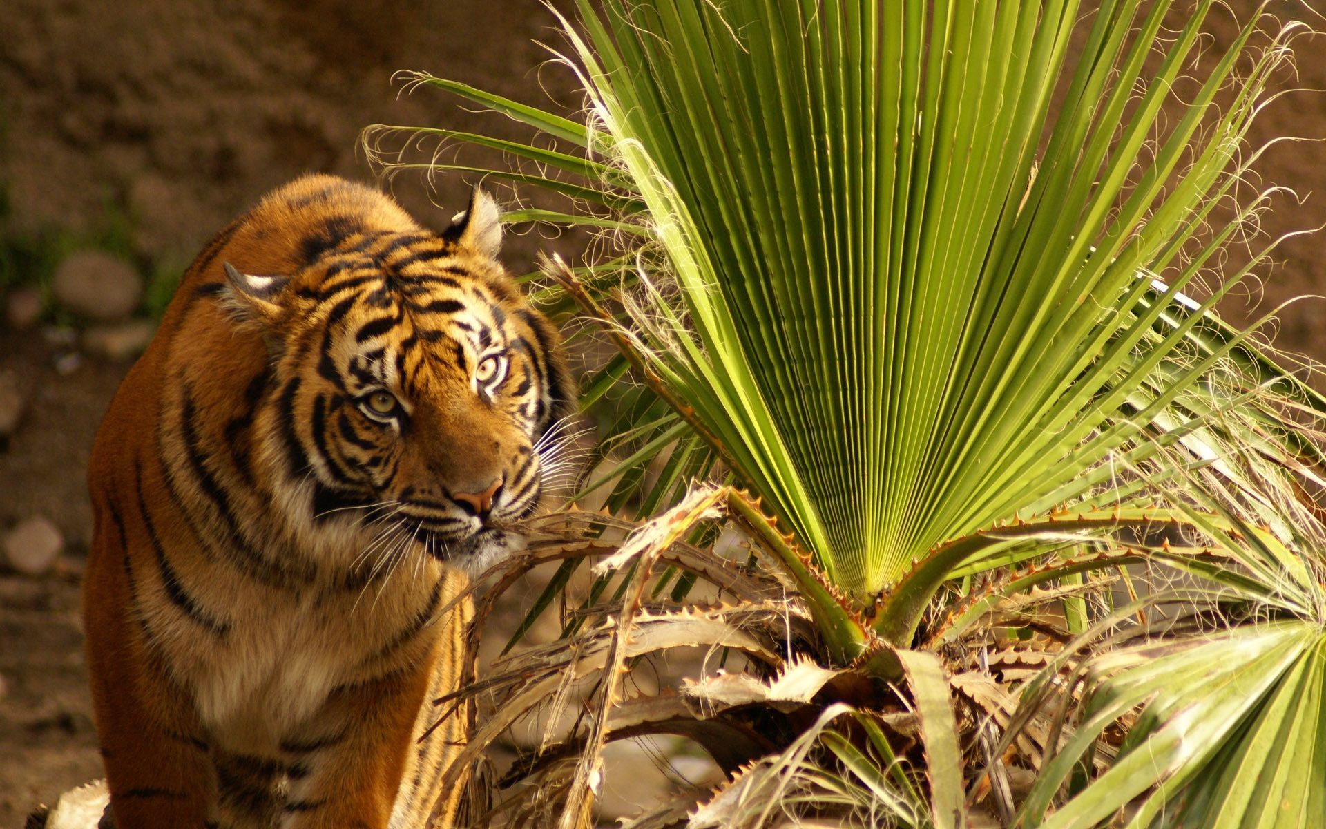 Tiger eyes leaves grass looks sits tense