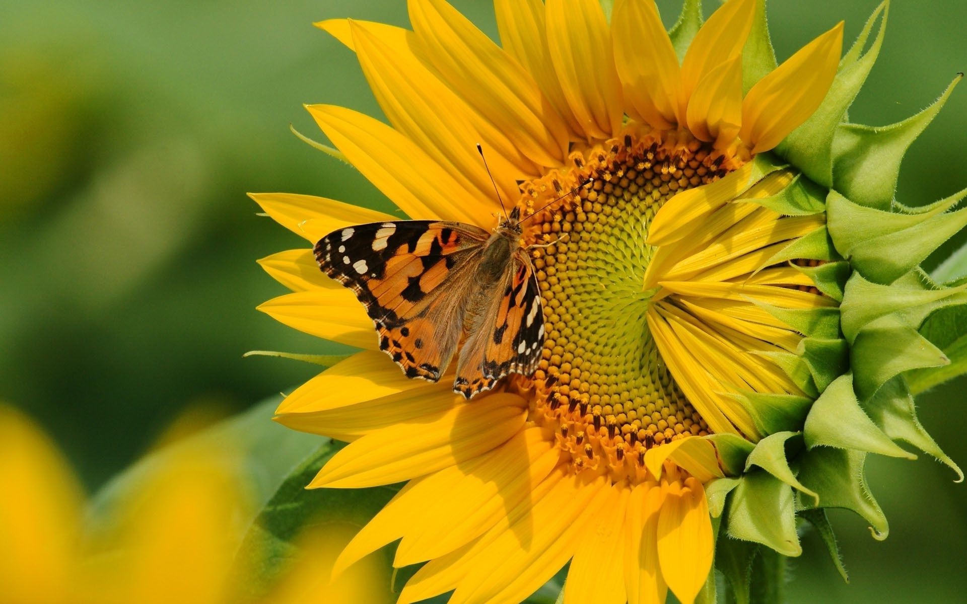 A butterfly pollinates a large sunflower