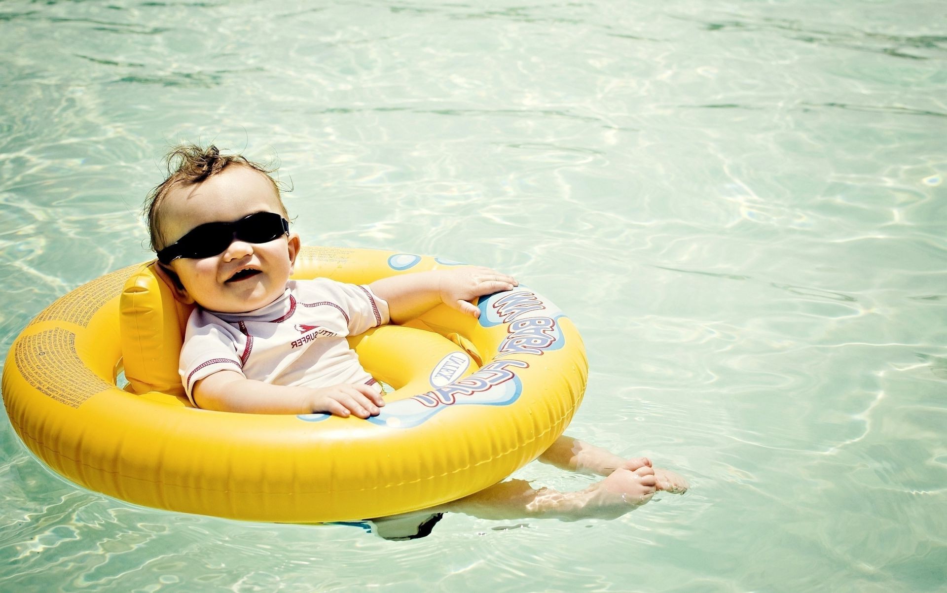 A child in sunglasses and a lifebuoy swims in the water