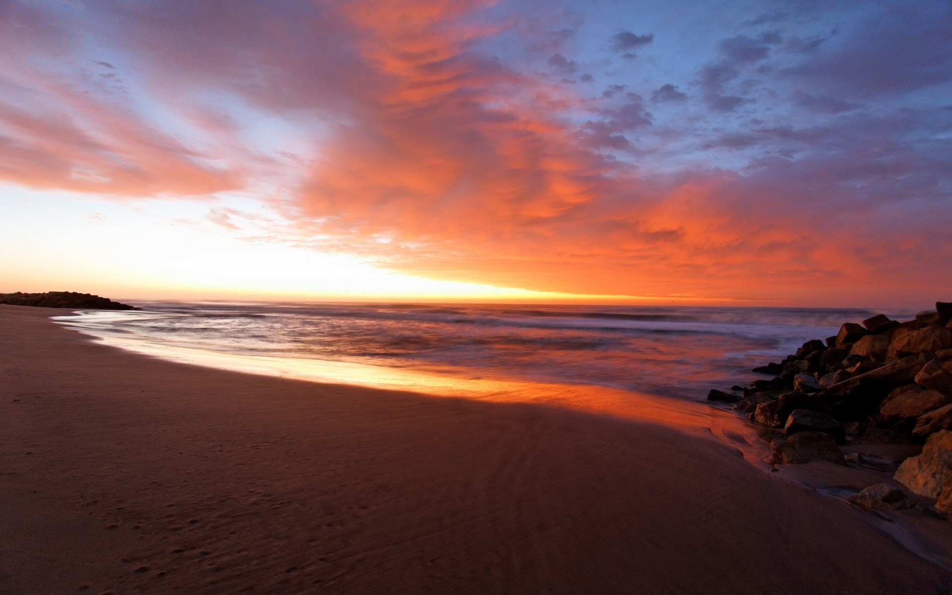 Beautiful seascape with waves, crumbly sand and sloping rocks