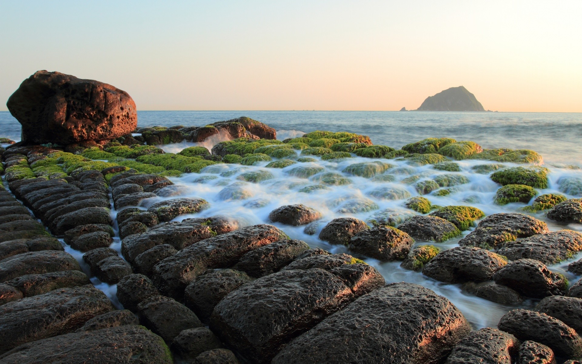 Boulders and rocks on a sandy beach. beautiful landscapeBoulders and rocks on a sandy beach. Beautiful landscape