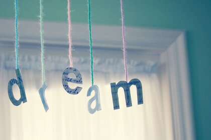 The letters are suspended on multicolored threads