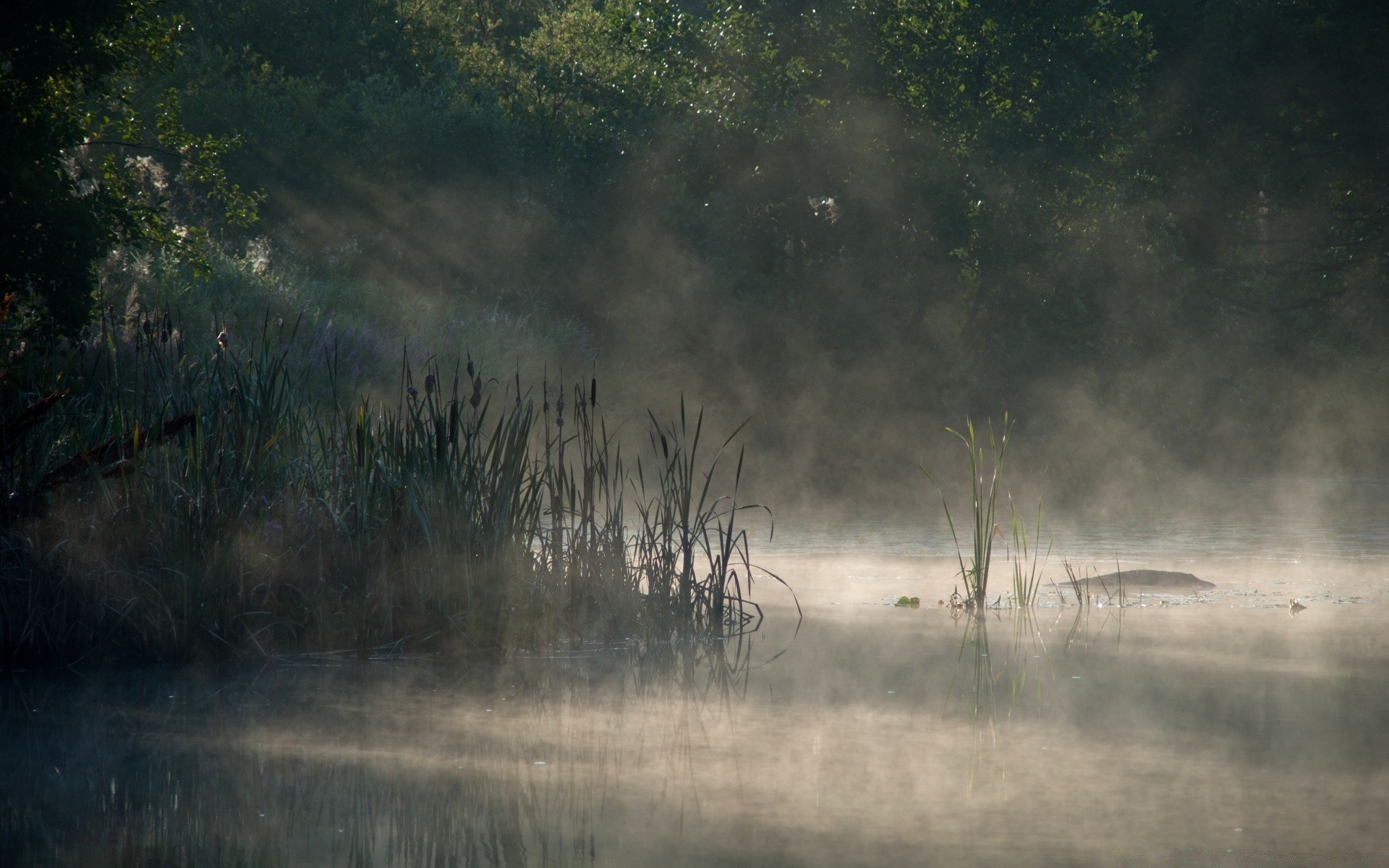 Fog over the lake. Reeds