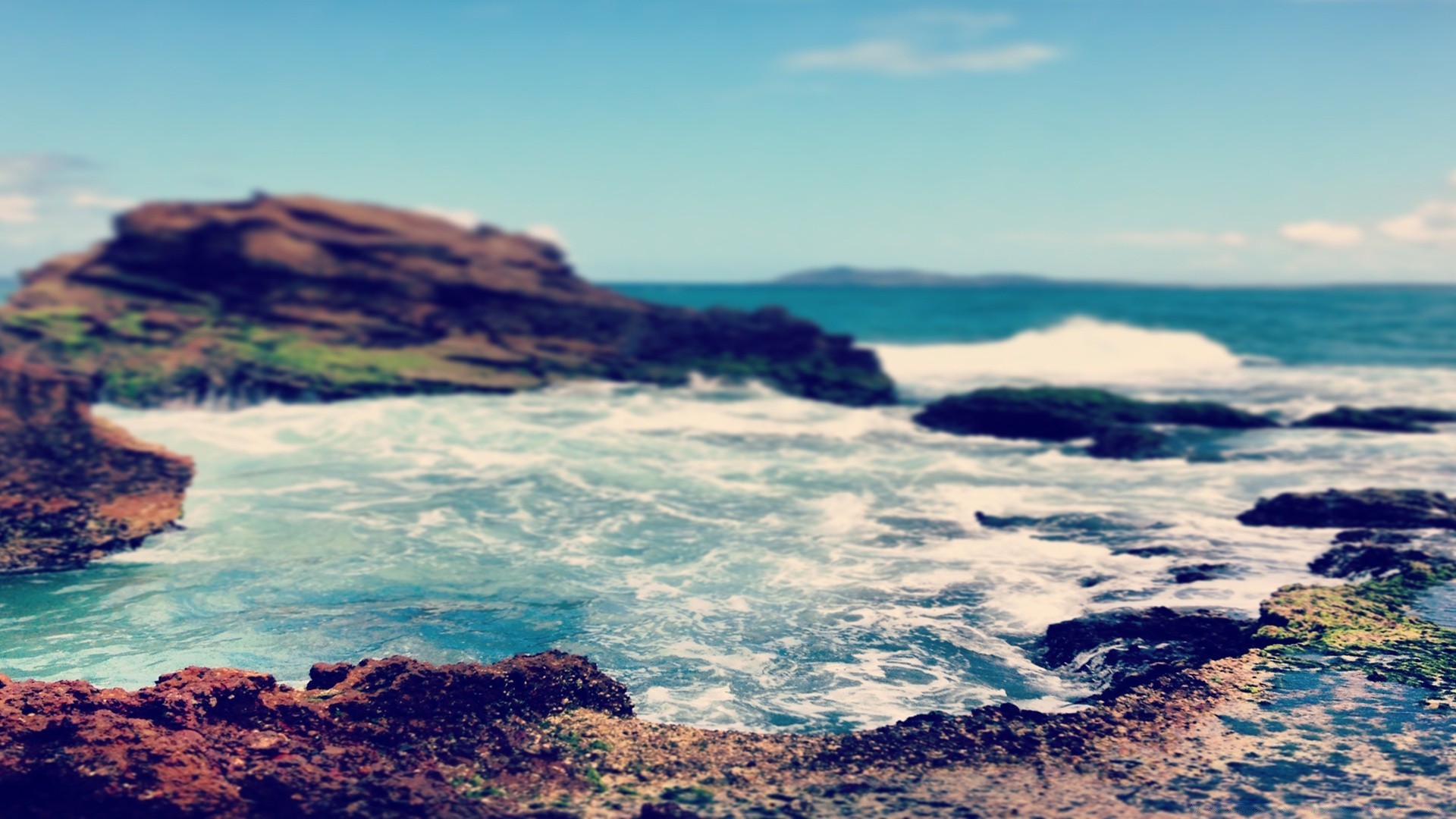 Transparent ocean with rocks in the fog