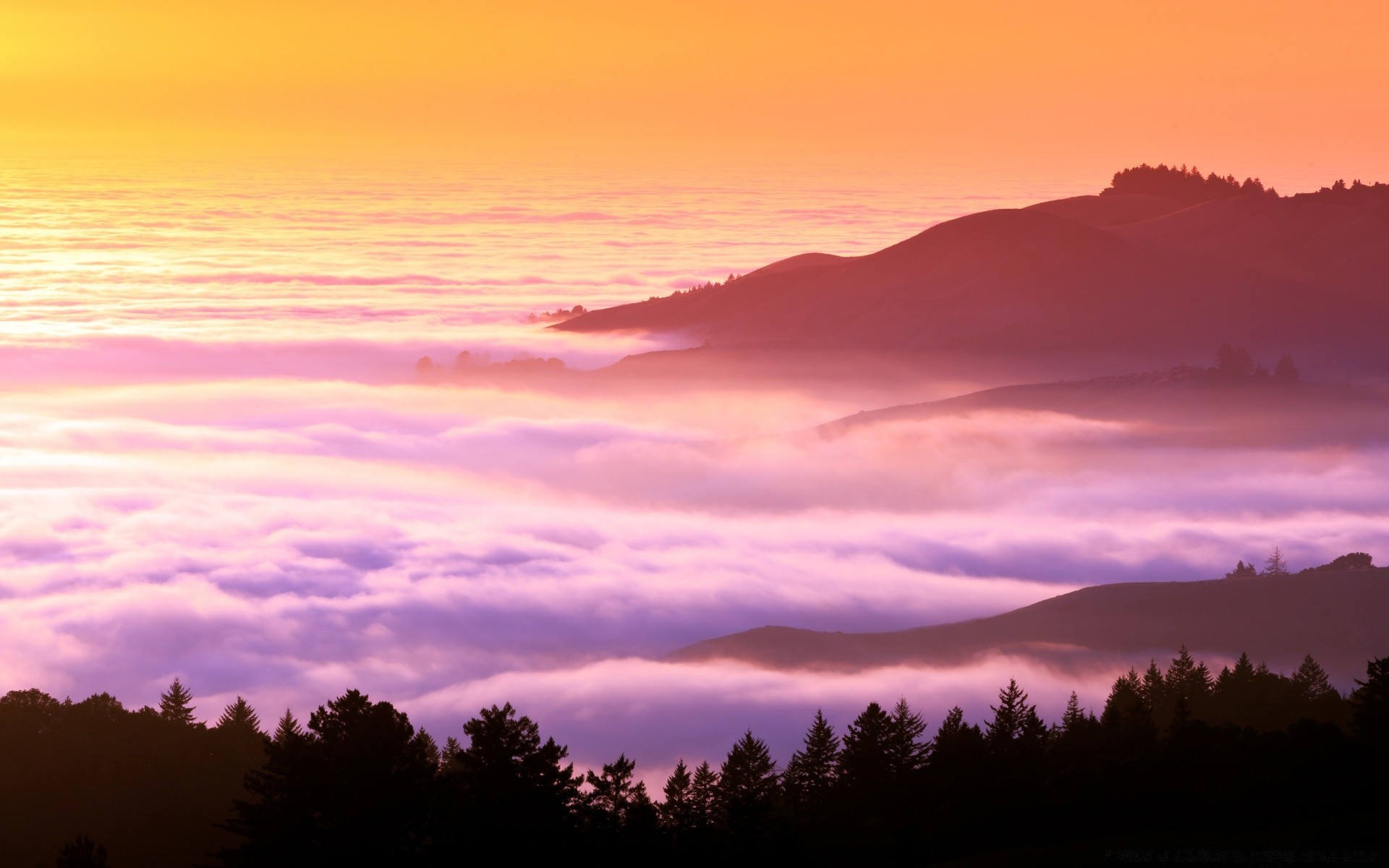 Lilac mist over the forest and mountains at sunsetLilac mist over the forest and mountains at sunset