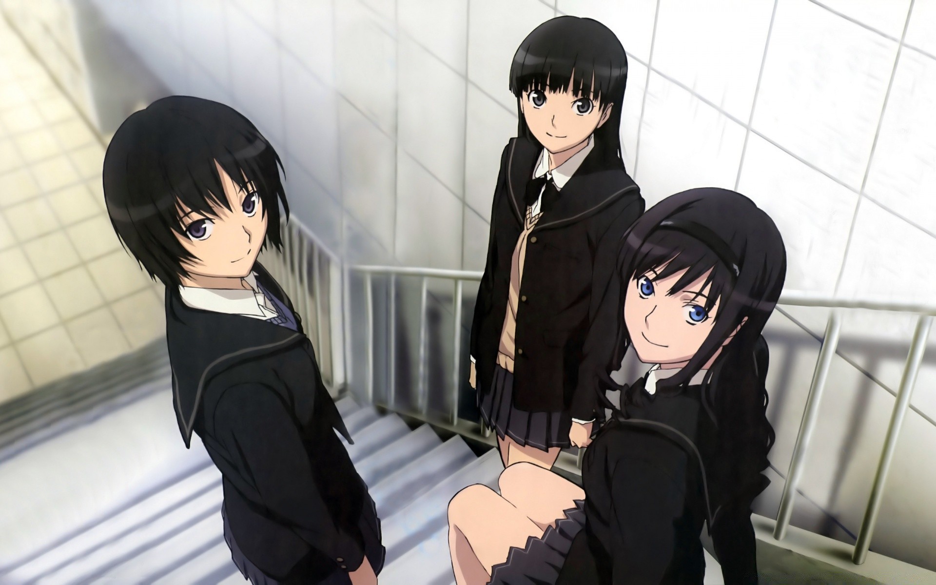 Three anime schoolgirls on the stairs