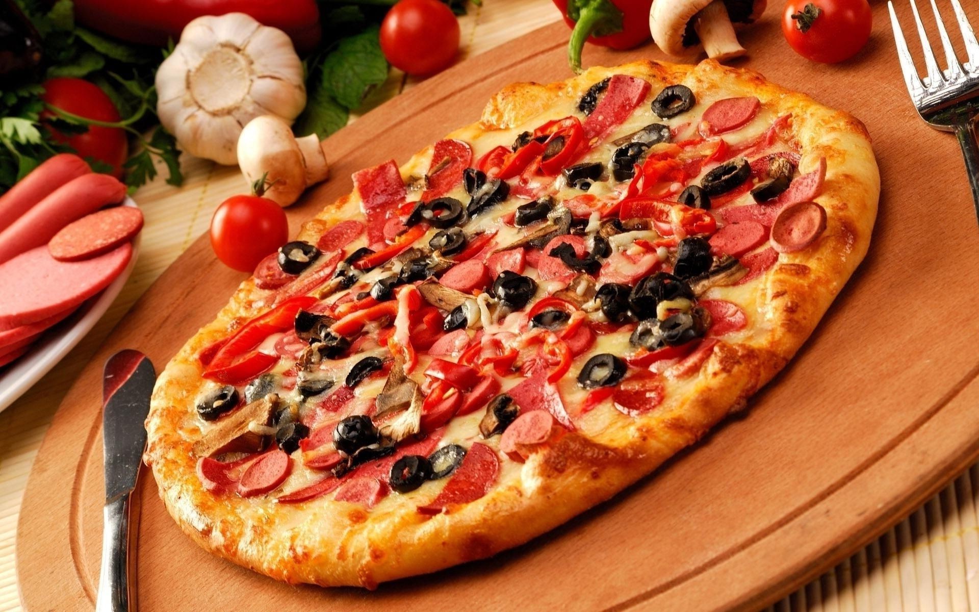A slice of pizza with chicken and mushrooms on a white plate with black stripes