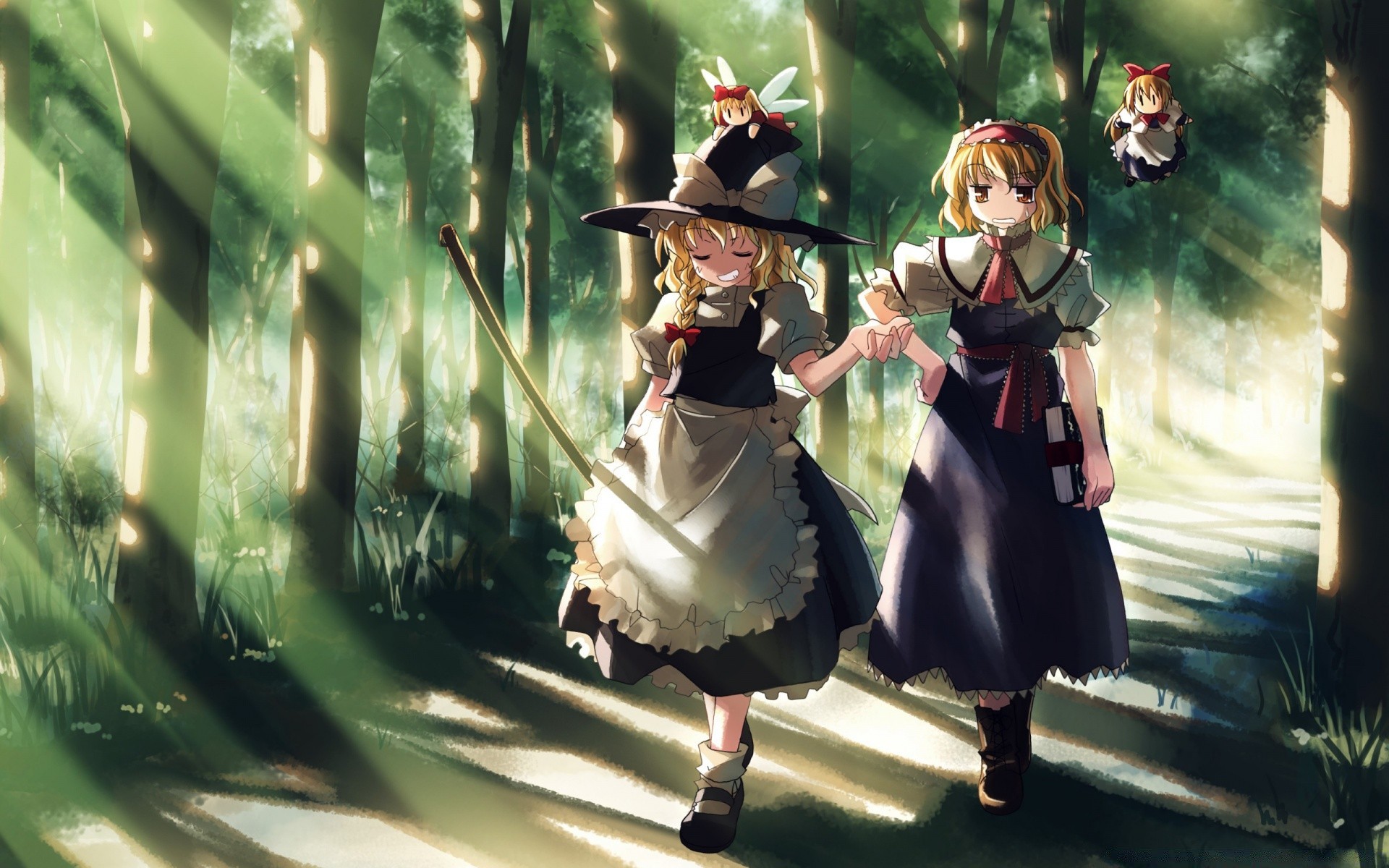 Anime girls are walking in the forest. Witch, fairies. The sun's rays among the trees