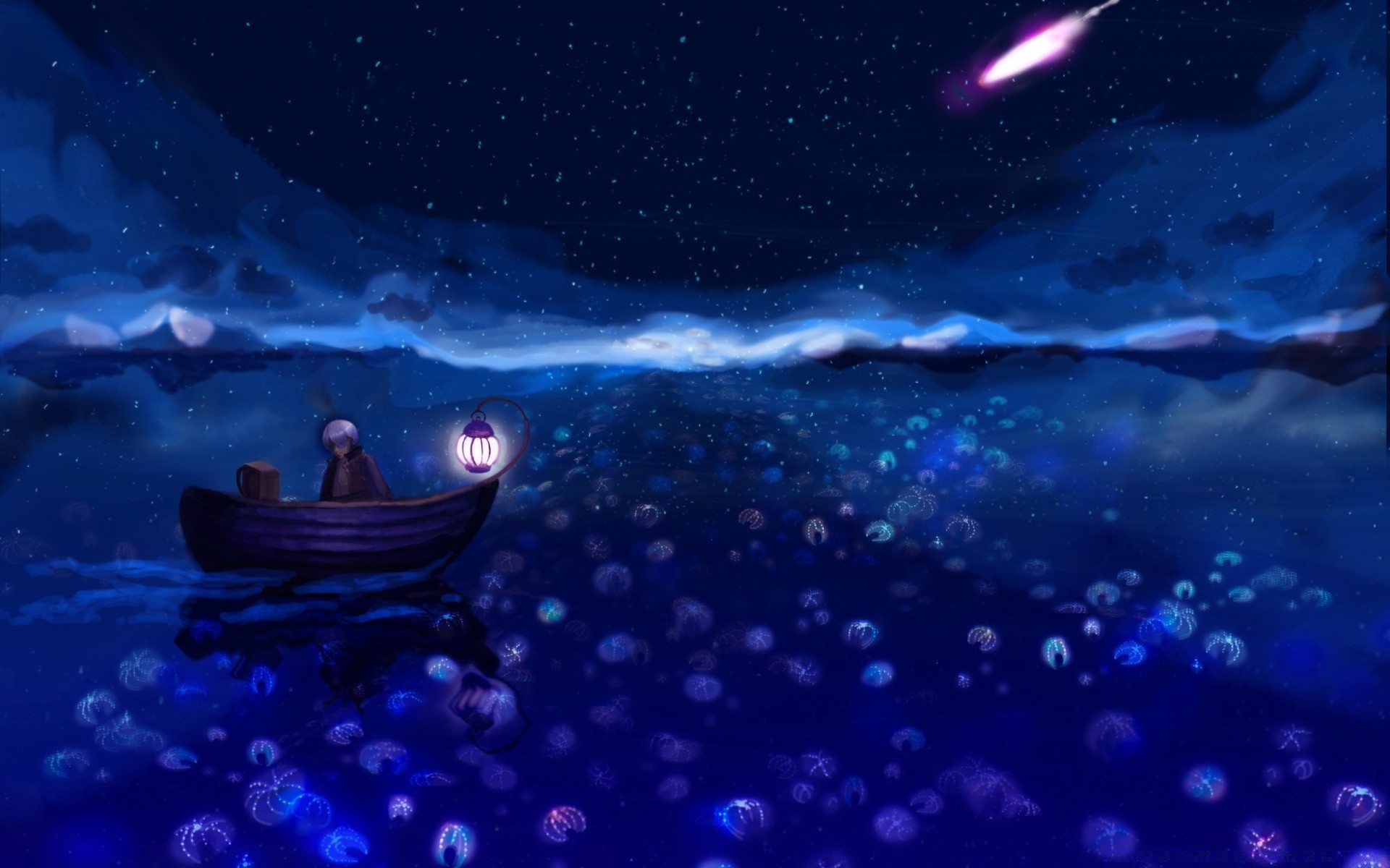 A lonely guy on a boat floats on the blue surface with jellyfish
