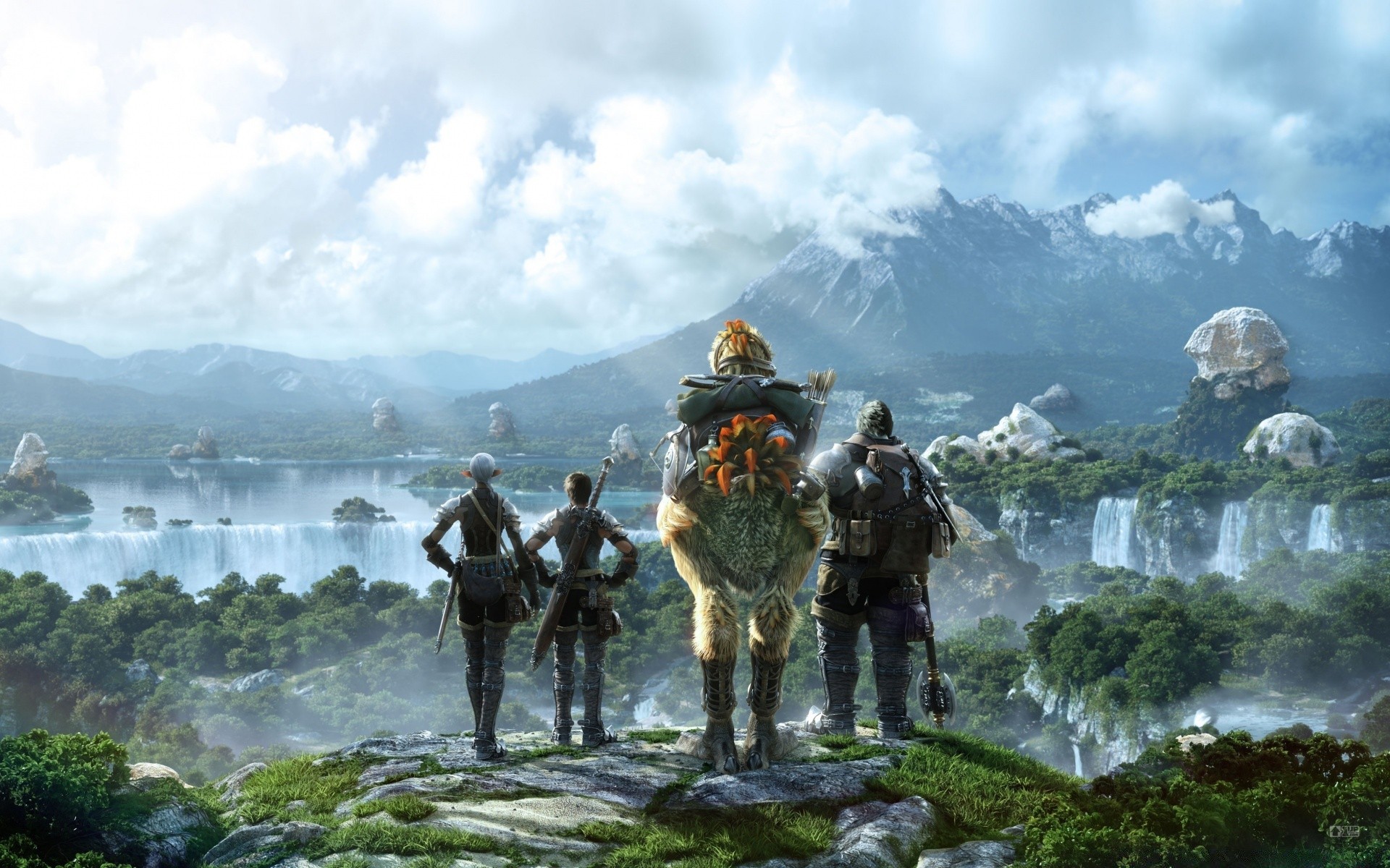 Traveling in front of a beautiful landscape of mountain waterfallsTraveling in front of a beautiful landscape of mountain waterfalls