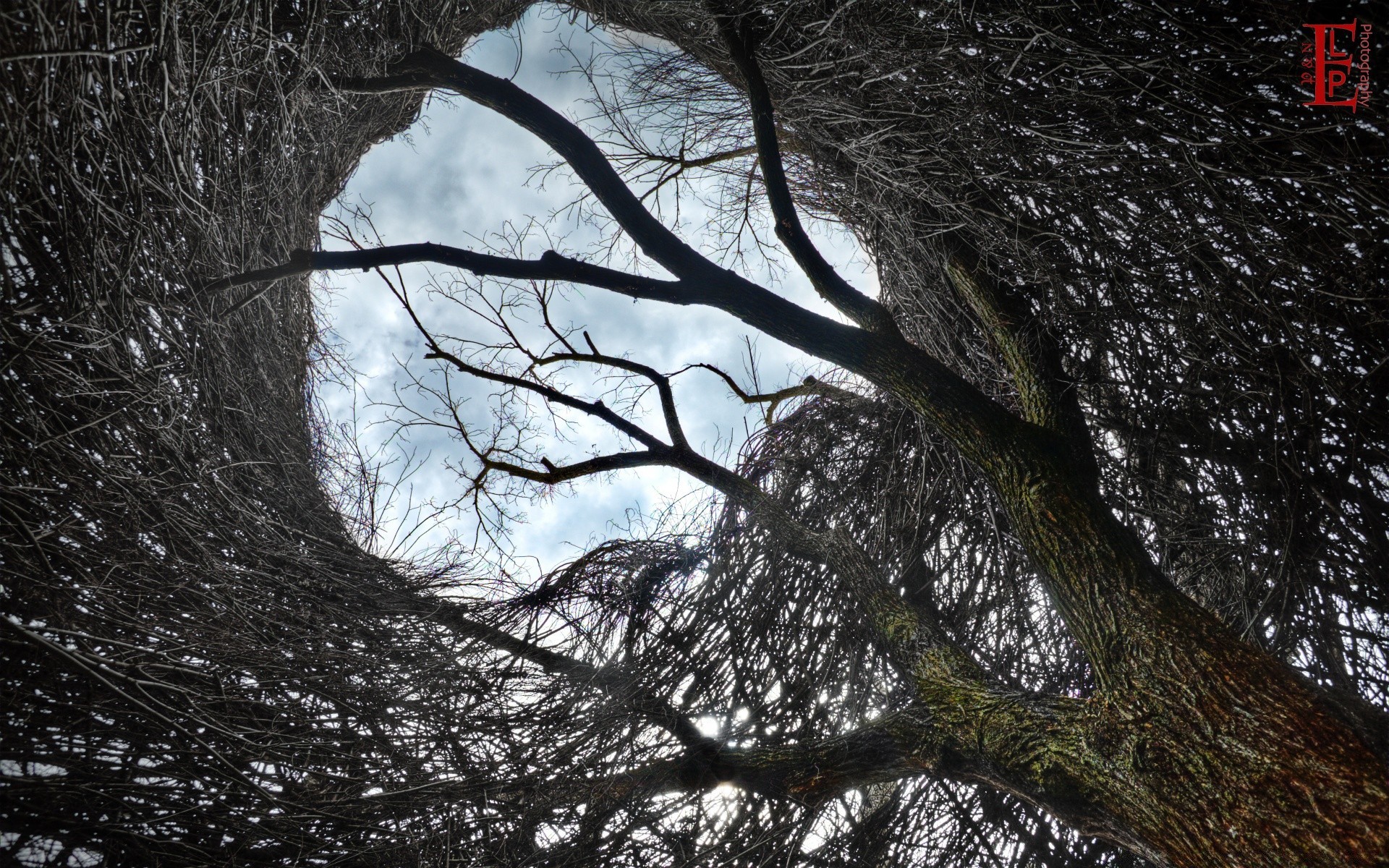 Moss-covered trees in a gloomy forest illuminated by the sun