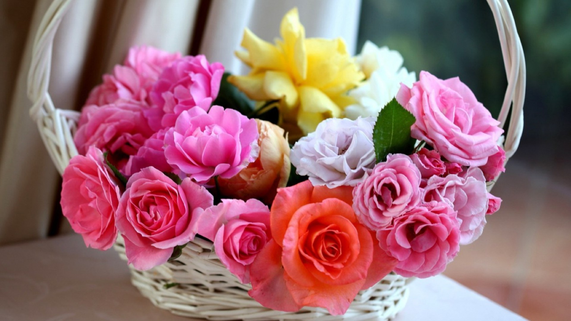 A wicker basket with greenery on the grass. Beautiful rural landscape