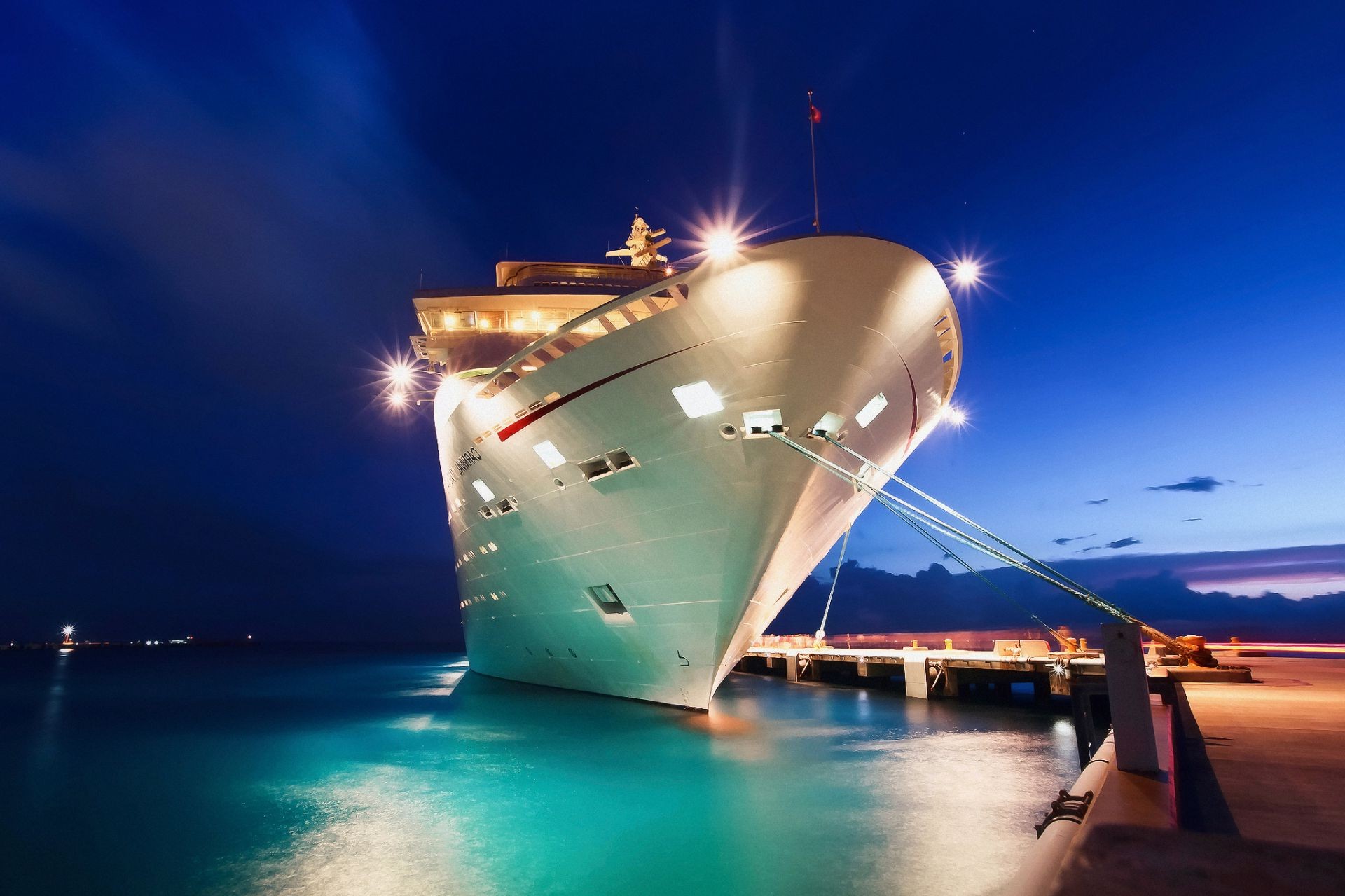 A ship on a pier on blue water