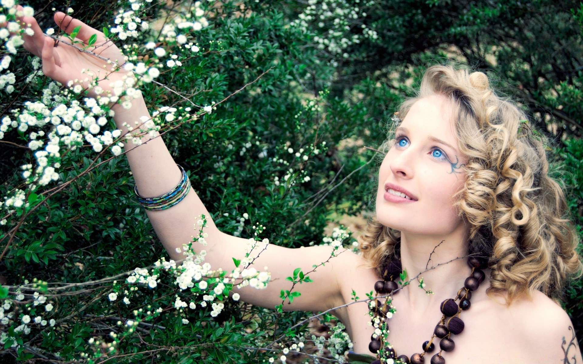 A girl with a necklace around her neck in a summer garden
