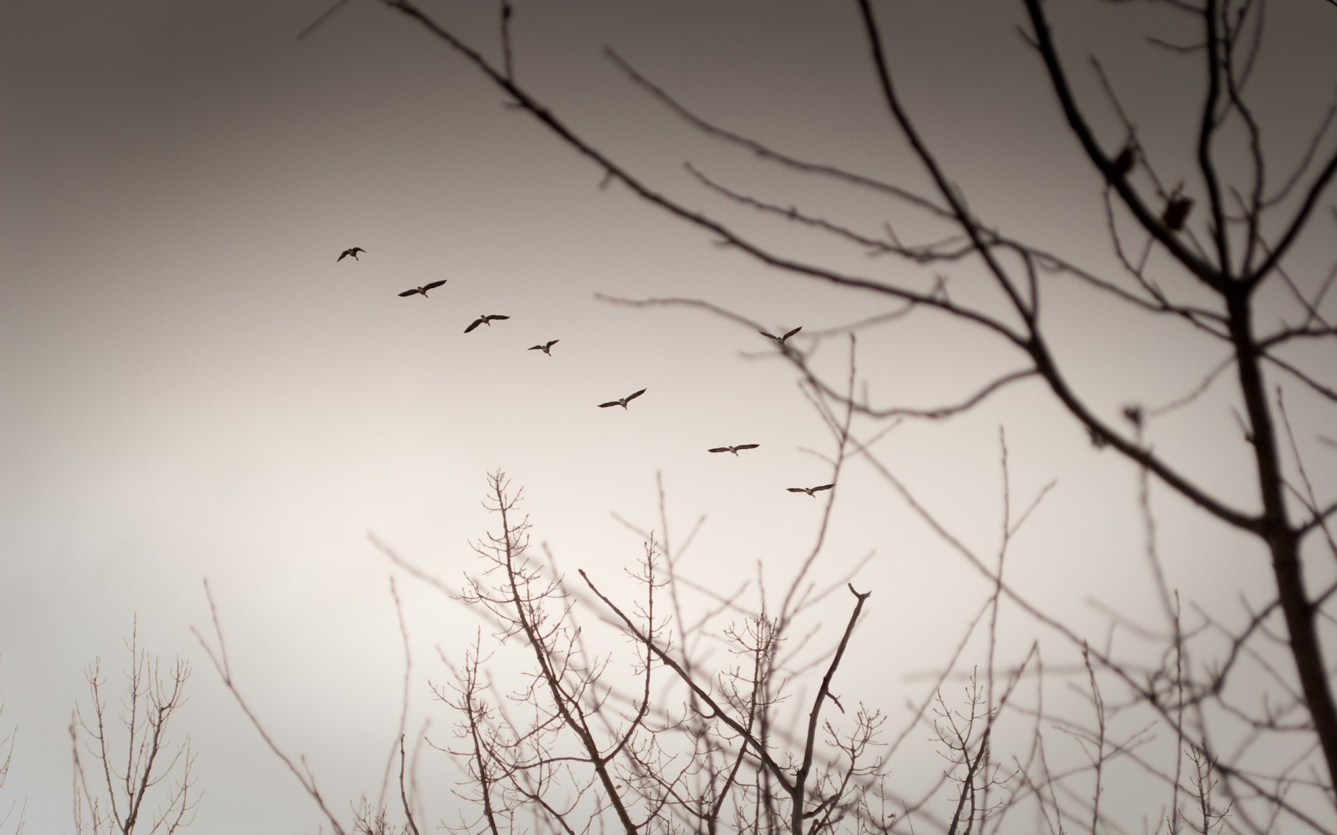 Is the bird flying away in silhouette, or are they birds? a flock of them, where are they flying to? The movement of nature