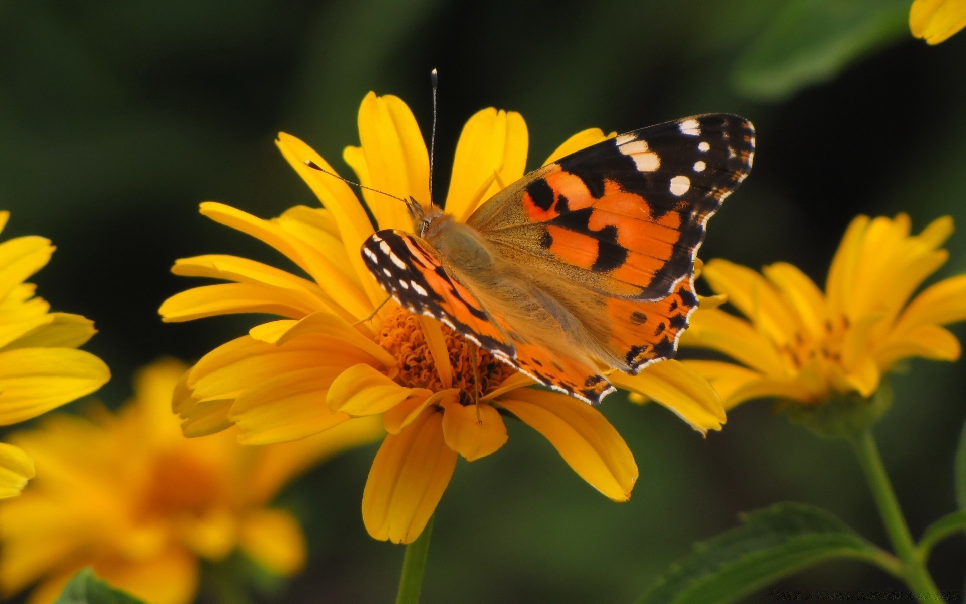 Butterfly on a yellow flower black background
