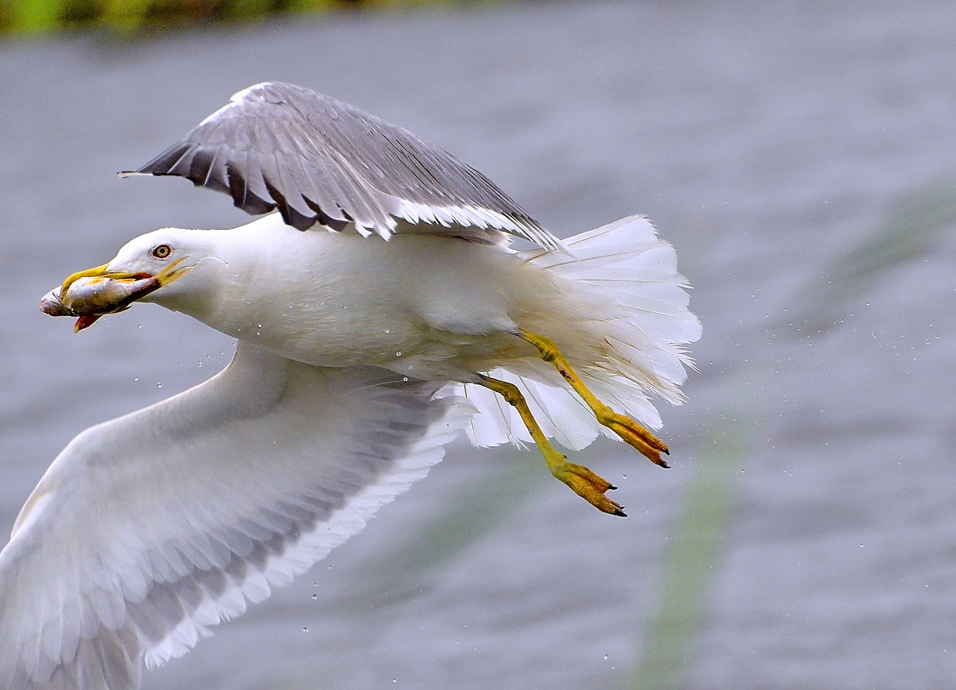 A seagull catching fish on the fly.