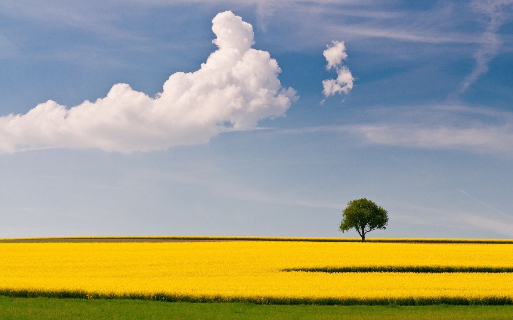 A yellow field and a tree against a blue sky background