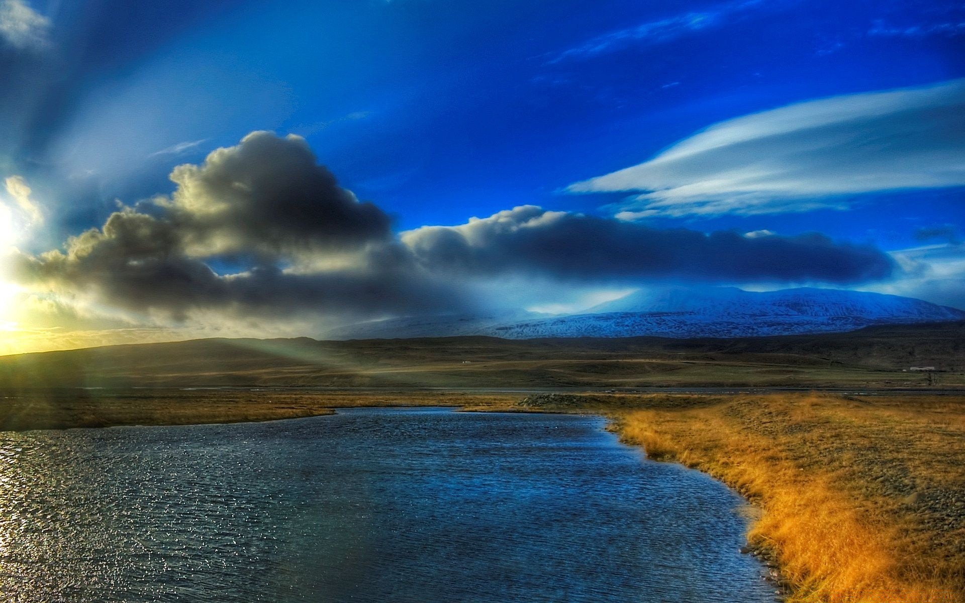 A pond surrounded by fields with yellow grass and a sky with clouds