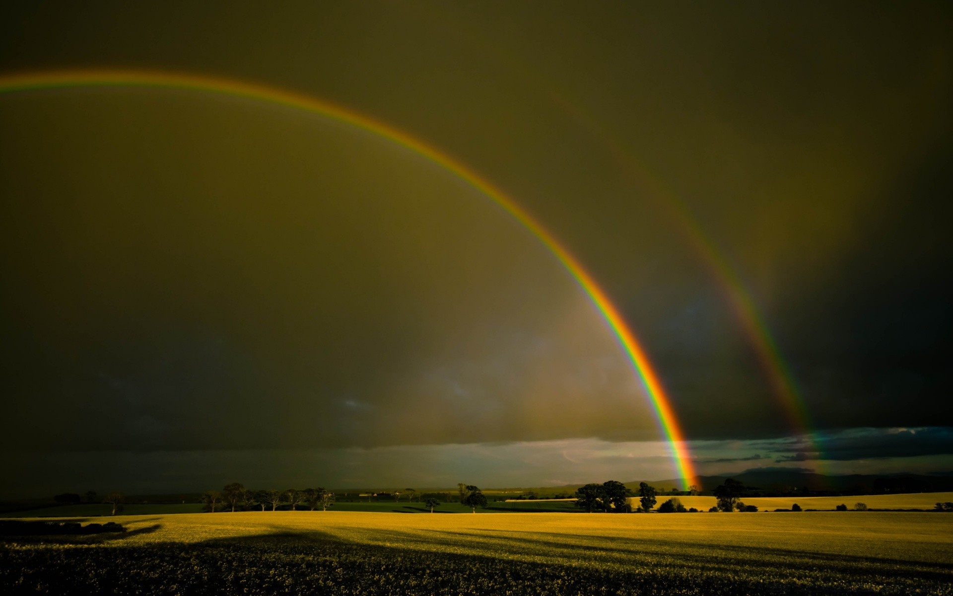 A rainbow in half the sky over a yellow field