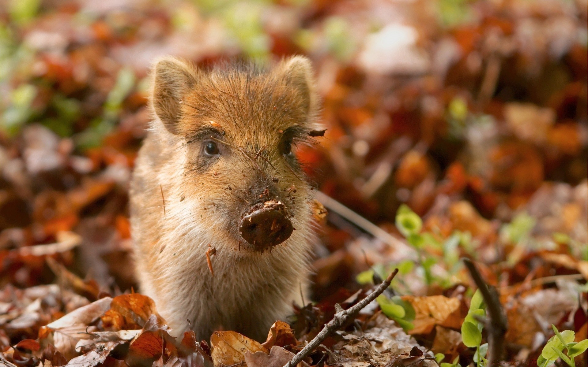 A baby boar in the autumn forest. Yellow foliage
