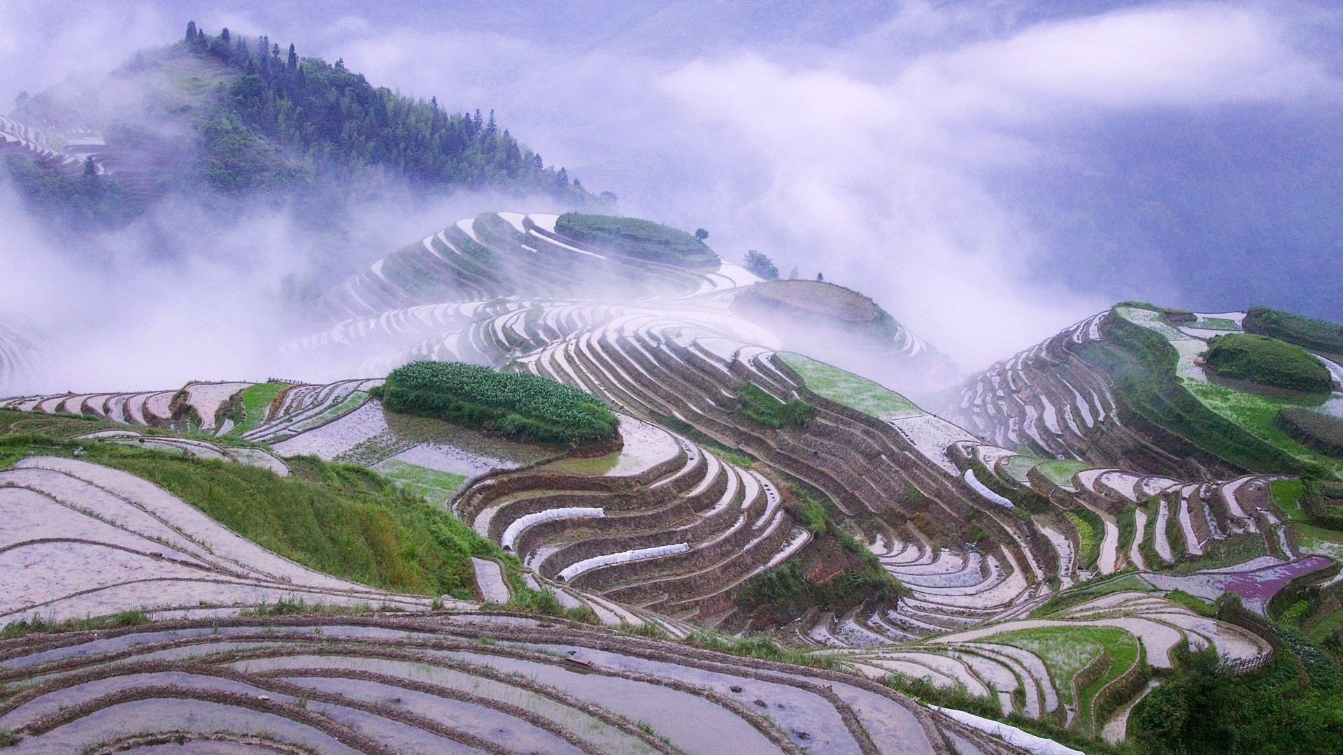 Mountain terraces in the pre-dawn fog