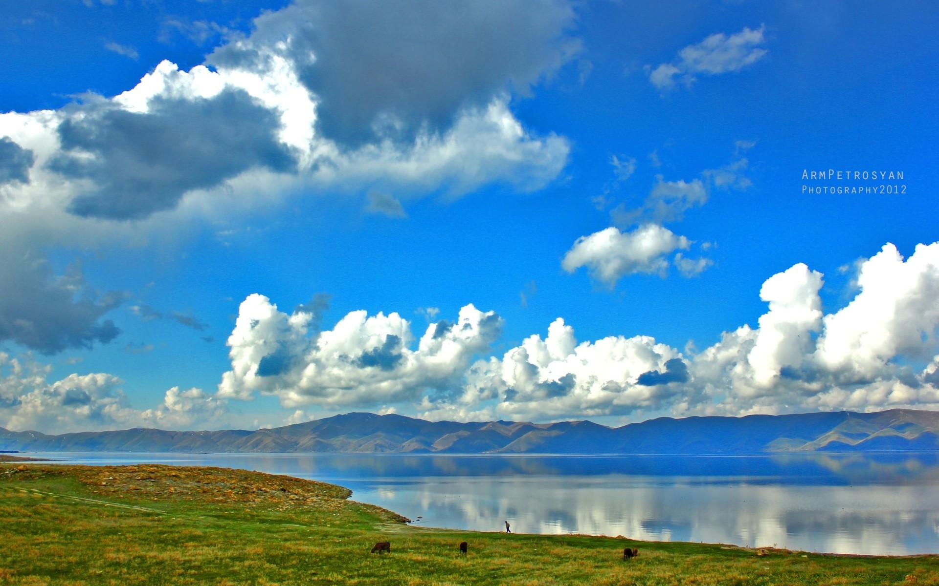 Frosty sunset reflected in the water of the river surrounded by rain-covered grass and trees